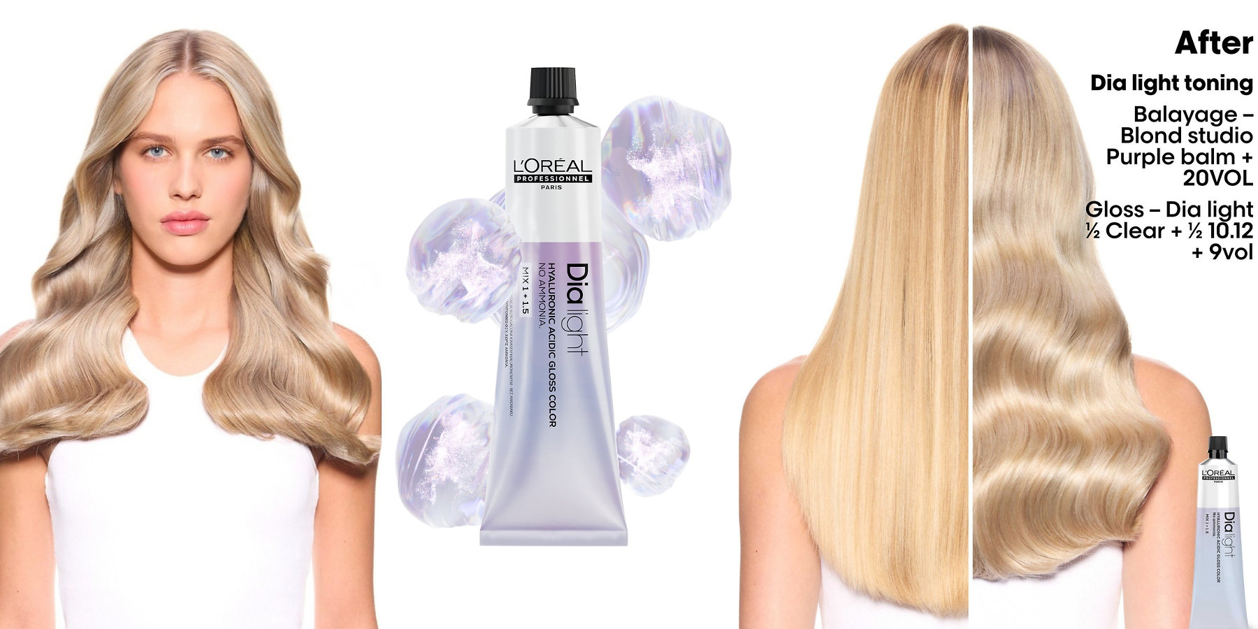 L’Oréal Dia Light přináší modernější a jemnější alternativu ke klasické permanentní barvě. Jde o demi-permanentní gloss barvu bez amoniaku s kyselou pH technologií a kyselinou hyaluronovou, která je navržená pro lesk, zjemnění tónu, neutralizaci nechtěných podtónů po zesvětlení i oživení délek bez života. Zároveň jde o první kyselou demi-permanentní barvu značky L’Oréal s hyaluronem, která spojuje barevný výsledek s pečujícím efektem – vlasy působí hydratovaněji, uhlazeněji a viditelně leskleji.