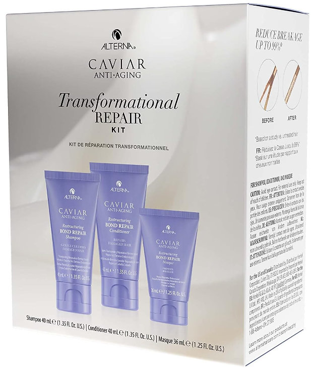 Dopřejte poškozeným vlasům intenzivní regeneraci i na cestách. Cestovní sada Alterna Bond Repair z řady Caviar Anti-Aging Restructuring Bond Repair pomáhá obnovovat narušené vlasové vlákno, posiluje vlasy a snižuje jejich lámavost. Díky technologii Caviar Bond Enforcing zaceluje poškozené části vlasu, omezuje krepatění a chrání vlasy před dalším poškozením i tepelným stylingem.