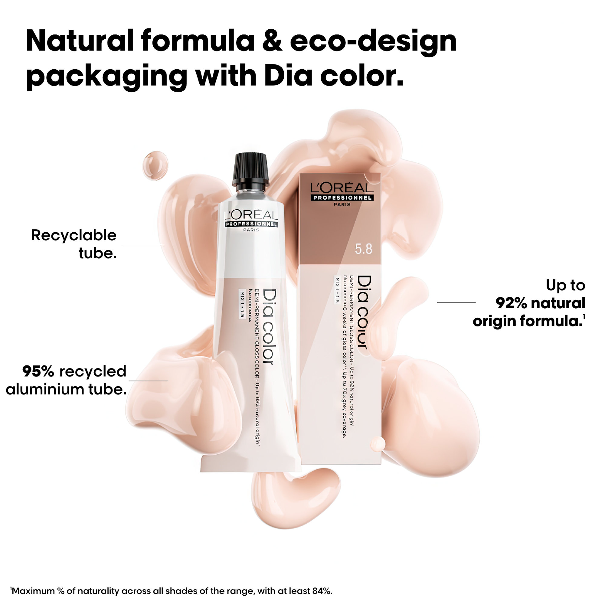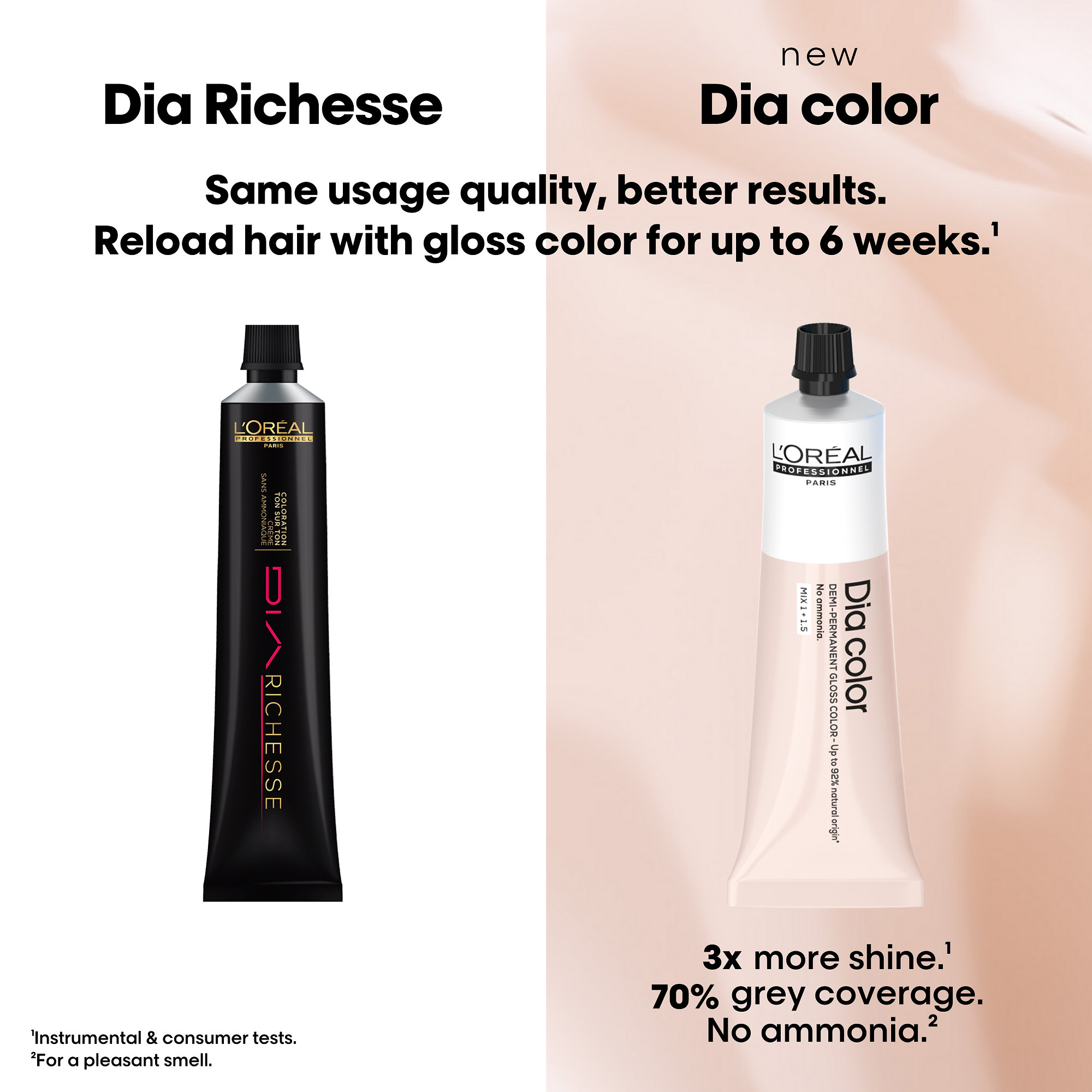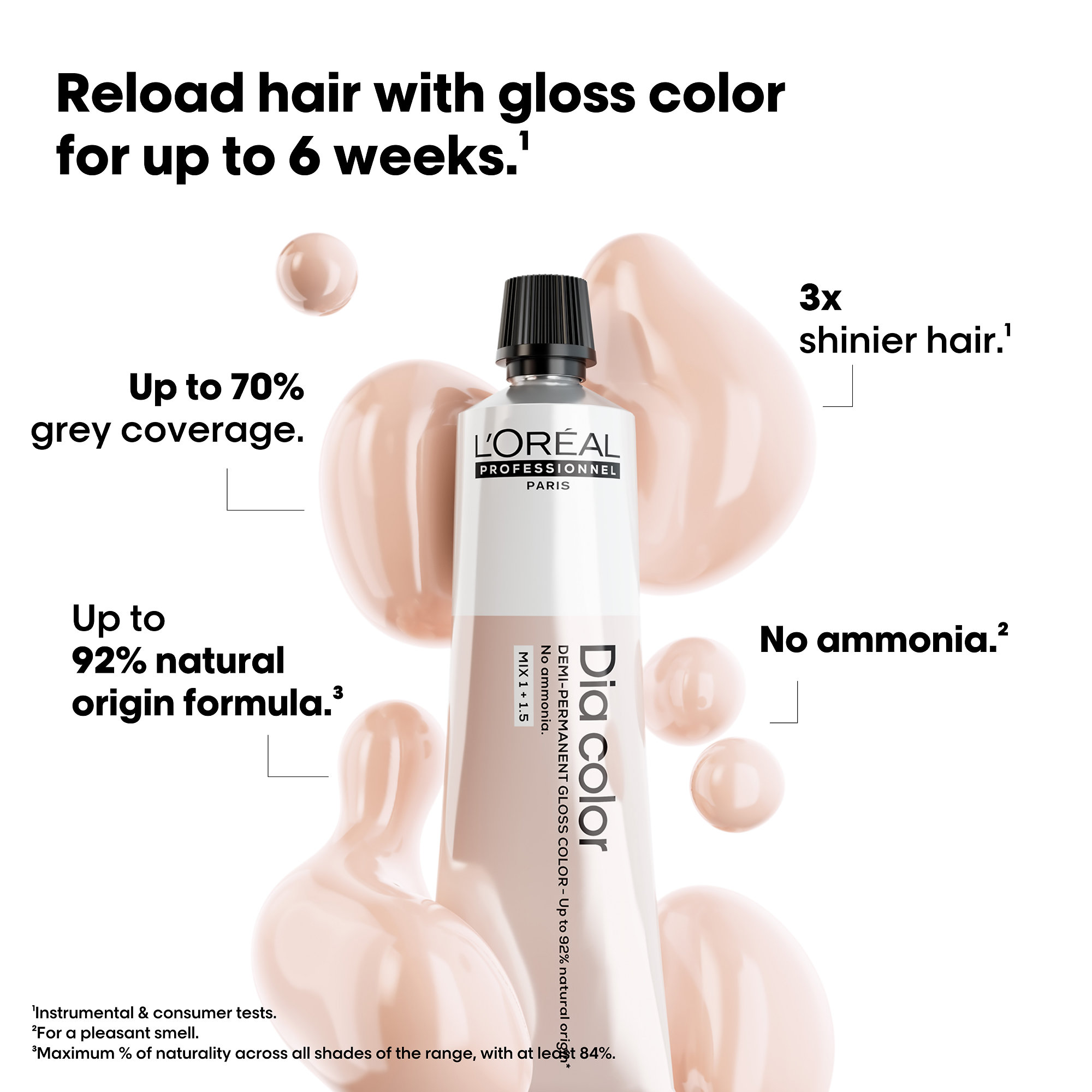 Objevte novou úroveň péče o vlasy s L'Oréal Professionnel Dia Color, inovativní alkalickou demi-permanentní barvou bez amoniaku, která přináší oslňující lesk a živou barvu bez kompromisů. Tato barva, dostupná v 40 odstínech, nabízí možnost mixování a personalizace pro výsledky na míru, přičemž pokrývá až 70% šedivých vlasů a zachovává intenzivní odstín až po 6 týdnů. Díky technologii Melanin Gap Filler a 92% přírodním složkám se vaše vlasy budou radovat z revitalizujícího efektu, který oživí barvu a dodá úžasný lesk.